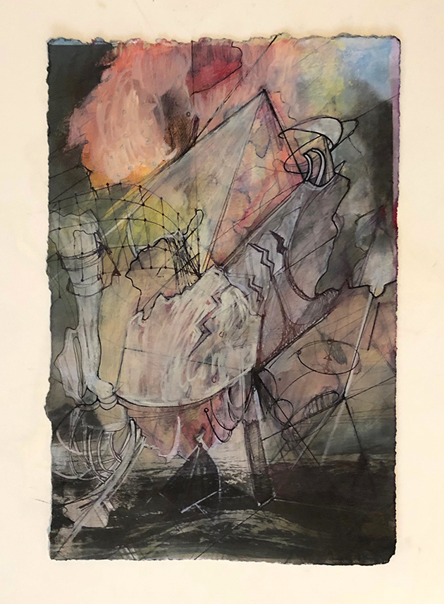 “I Swear to God (& oh gawd), Demons of Depression Reach Through the Television Anytime You Watch Netflix.”, 2018, ink, pen and watercolour on Arches paper.